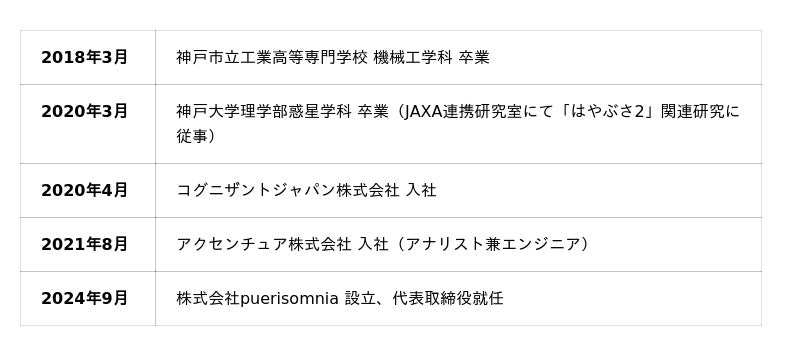 卒業後は、JAXA関係者から「ロボットを世に広めるには、技術だけでなく資金と人脈が必要だ」とのアドバイスを受け、外資系コンサルタントとして事業・IT領域の経験を積む。2024年9月、フィジカルAIとエンタメを掛け合わせ、ロボットバトルを世界的な競技にすることを目指し、株式会社puerisomnia を設立。