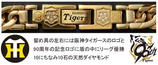 阪神タイガース創設90周年を記念して天然ダイヤモンド10石をちりばめたアクセサリーが登場。ブレスレットにもネックレスにも阪神タイガースがリーグ優勝した数と同じ10の天然ダイヤを盾に散りばめました。その輝き1石1石が阪神タイガースの栄光の歴史そのもの。ファンならずとも見るたびに思いを馳せる事でしょう。ボディは軽くて頑丈なチタン素材にNASAの宇宙開発技術であるイオンプレーティングで純金を含んだ成分を蒸着させました。メッキとは違い剥がれることはなく、阪神タイガースの様に永遠の輝きを放ち続けます。記念限定品の為、売り切れの際にはご容赦ください。