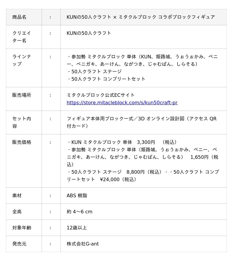 株式会社G-ant(所在地:東京都中央区、代表取締役:平川 彰悟)は、YouTuberのKUN氏が主催するゲーム実況企画「KUNの50人クラフト」とコラボレーションしたミタクルブロックコラボフィギュアを、2025年4月1日(水)9:00より期間限定で受注販売を開始いたします。