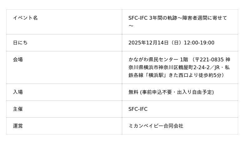 ミカンベイビー合同会社(本社:【所在地】、代表社員:寺澤裕太)が運営する福祉コミュニティ型ラボ「SFC-IFC」は、障害分野を中心にこれまで深めてきた3年間に渡る活動を記念して、12月3日から12月9日の障害者週間明けの2025年12月14日(日)に写真展イベントを開催します。会場は横浜駅から徒歩5分の「かながわ県民センター1階」。障害やインクルーシブな社会づくりをテーマに歩んできた3年間の活動を、写真や音声等で振り返る1日限りの展示です。
