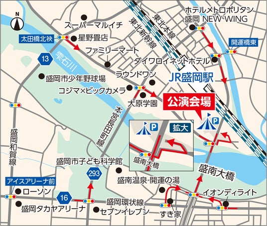 ●車両、歩行者ともに会場の出入り口は【盛岡駅側 盛南大橋袂の交差点 北上川方面に下る道路】1か所のみとなります。
