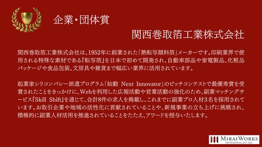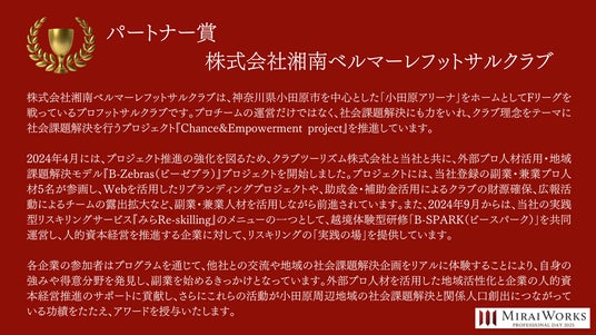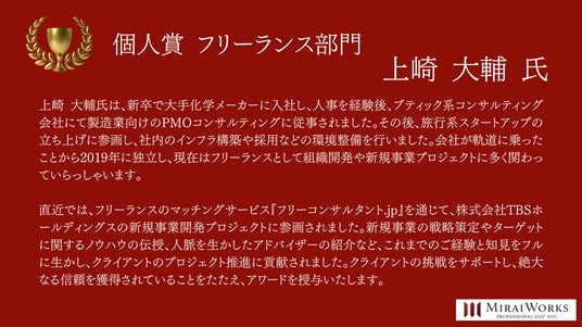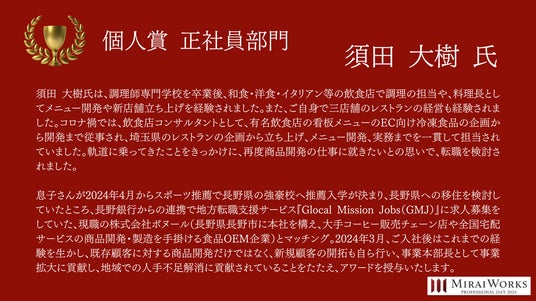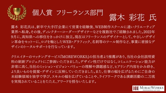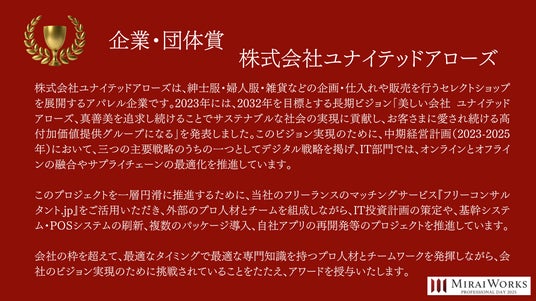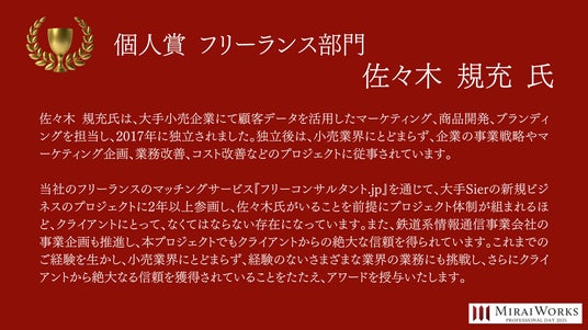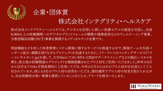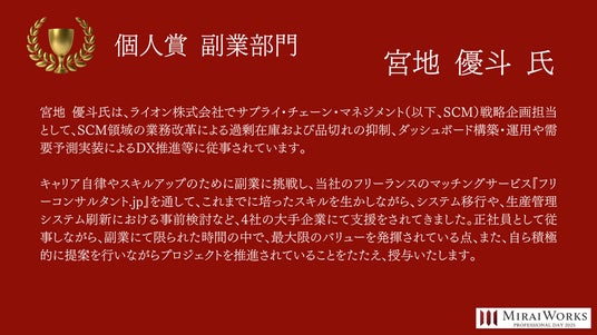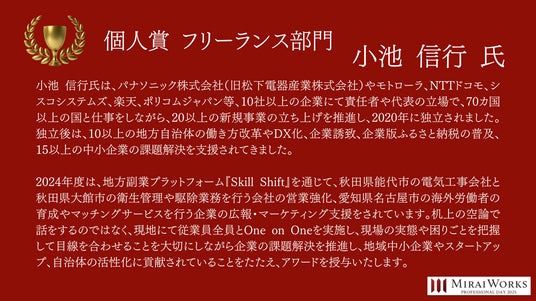 株式会社みらいワークス(本社:東京都港区、代表取締役社長 岡本祥治、以下「当社」)は、「プロフェッショナル アワード」の2024年受賞者を決定し、授賞式を執り行いました事をお知らせいたします。