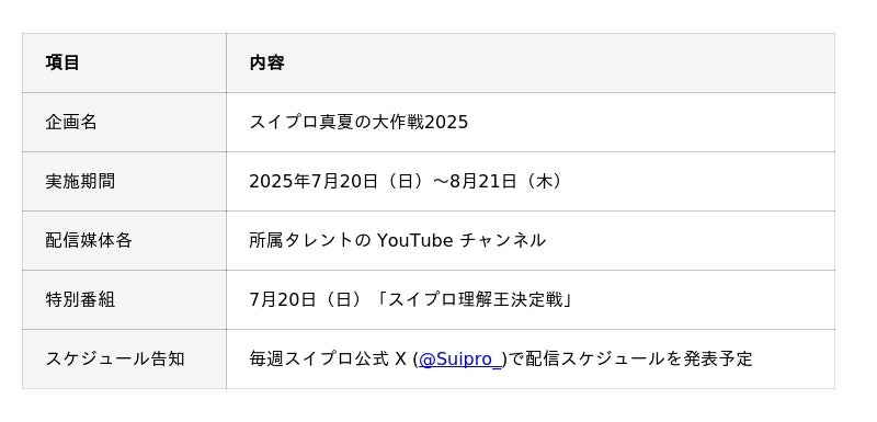 本企画は、夏休みシーズンに合わせてスイプロ所属タレントの魅力を幅広い層へ届けることを目的に実施します。既存ファンには推しの新たな一面を、新規視聴者にはスイプロを知るきっかけを提供し、1か月を通じてコミュニティの拡大を図ります。