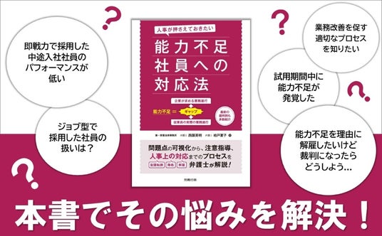 株式会社労務行政(所在地:東京都品川区 代表取締役:石川 了)は、新刊『人事が押さえておきたい 能力不足社員への対応法』を発売します。労働問題・労使トラブル解決の第一線で活躍する西頭英明弁護士、柏戸夏子弁護士(第一芙蓉法律事務所)が、能力不足社員への対応に関するノウハウを詰め込んだ一冊です。