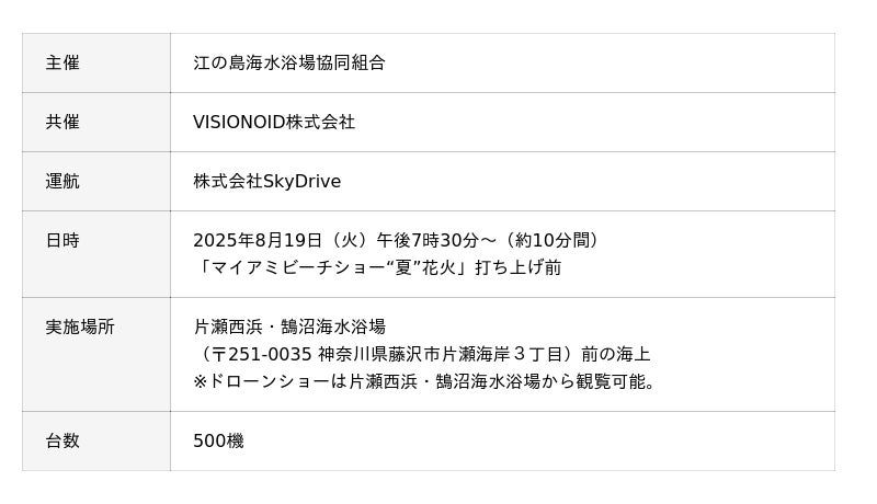 VISIONOID株式会社(東京都港区、代表取締役:竹中悠満、以下「VISIONOID」)は、2025年8月19日(火)、神奈川県藤沢市の片瀬西浜・鵠沼海水浴場にて開催されたイベント「江の島伝説 天女と龍神」において、500機のドローンによる大規模な演出を実施しました。当日は、約3万5,000人の人々がドローンショーを観覧しました。また海水浴場全体では、約5万7,000人にのぼり1日の来場者数でコロナ以降最多を記録しました。