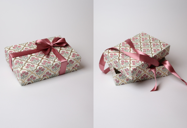 スリーブ構造(特許出願中)を採用し、ラッピングマイスターが一点ずつリボンを結んだ“店頭仕上げそのまま”のギフトボックス。贈る人は中身を入れてスリーブを戻すだけで、誰でもプロの仕立てを再現できます。