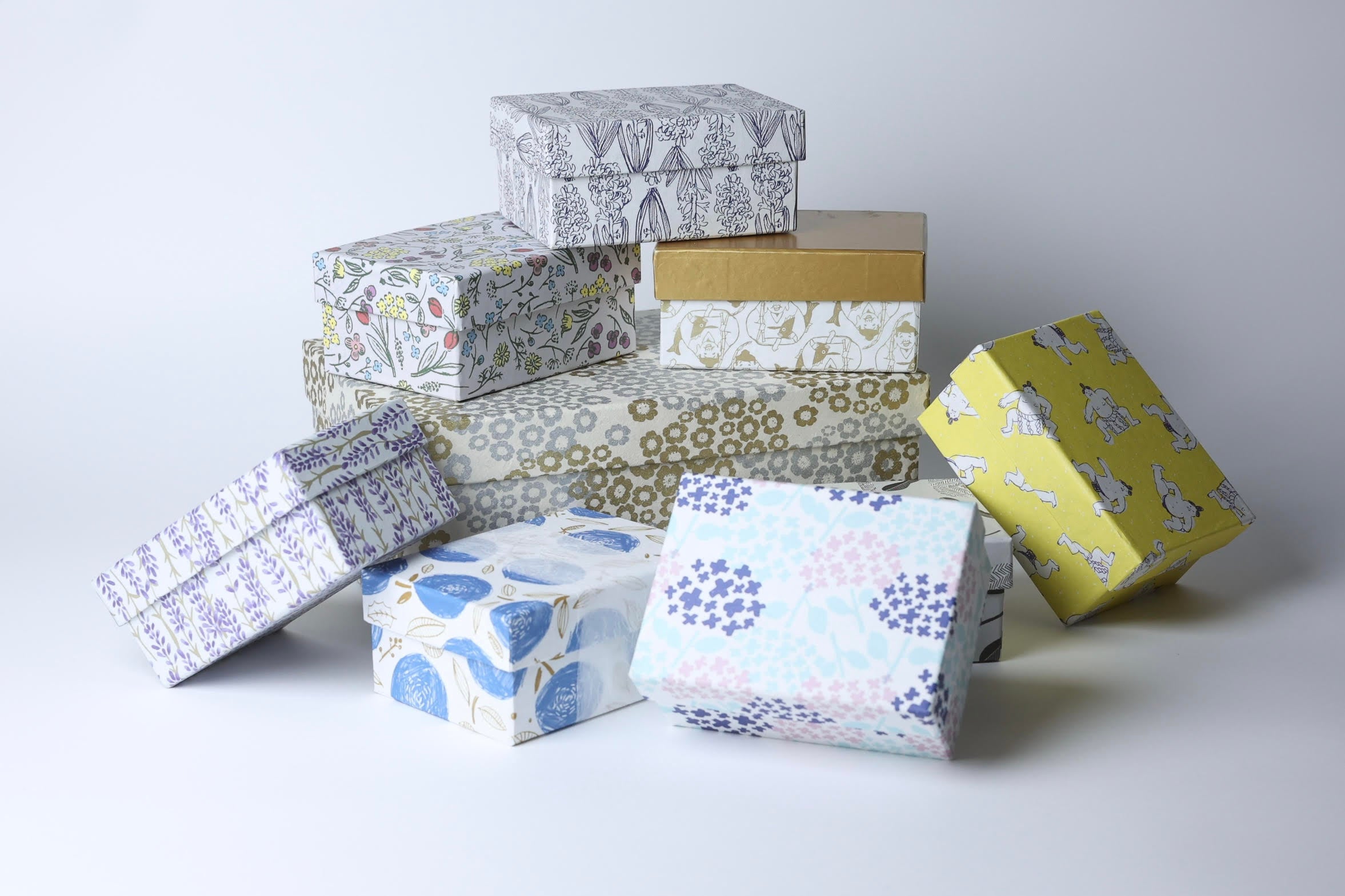 ラッピングマイスターが一点ずつ手作業で仕上げる再利用可能な貼り箱。