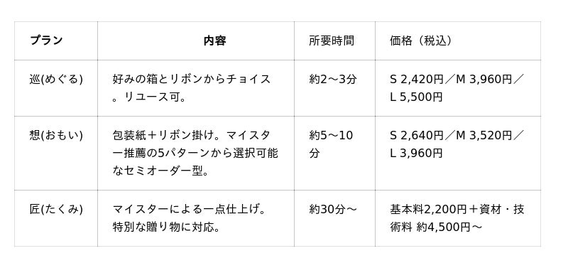 『巡(めぐる)・想(おもい)・匠(たくみ)』--店頭で選べる三つの包みプラン
