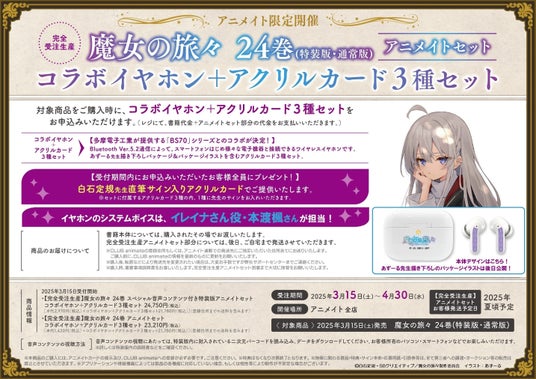 全国アニメイト・アニメイト通販では「コラボイヤホン」、「アクリルカード3種セット」が有償特典として付く、『魔女の旅々』24巻「アニメイト限定セット」を販売いたします。