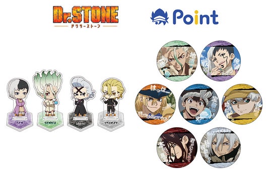 アニメイトポイント景品に、TVアニメ『Dr.STONE』の千空やゲンたち4人の描き起こしイラストを使用した「アクリルスタンド」や、「台詞 缶バッジ」が登場! アニメイト通販にて予約受付中!!
