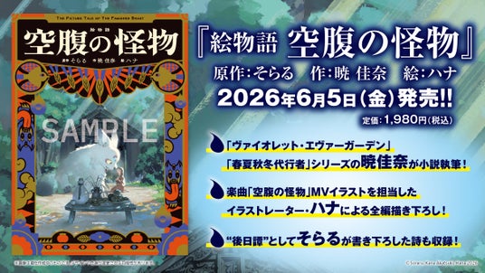 『空腹の怪物』とは、ネットシーンを中心に活躍するアーティスト・そらる氏作詞の楽曲で、「人の悲しみを喰らうことで生き続ける怪物と、その怪物の生贄として差し出された少女」の物語が描かれています。ノベライズは、シリーズ累計発行部数70万部超&TVアニメ・劇場版も制作された「ヴァイオレット・エヴァーガーデン」や、シリーズ累計75万部を突破し、26年春にTVアニメ化を予定している「春夏秋冬代行者」シリーズの暁佳奈氏が、イラストはMVのイラストを手掛けたイラストレーター・ハナ氏がそれぞれ担当します。