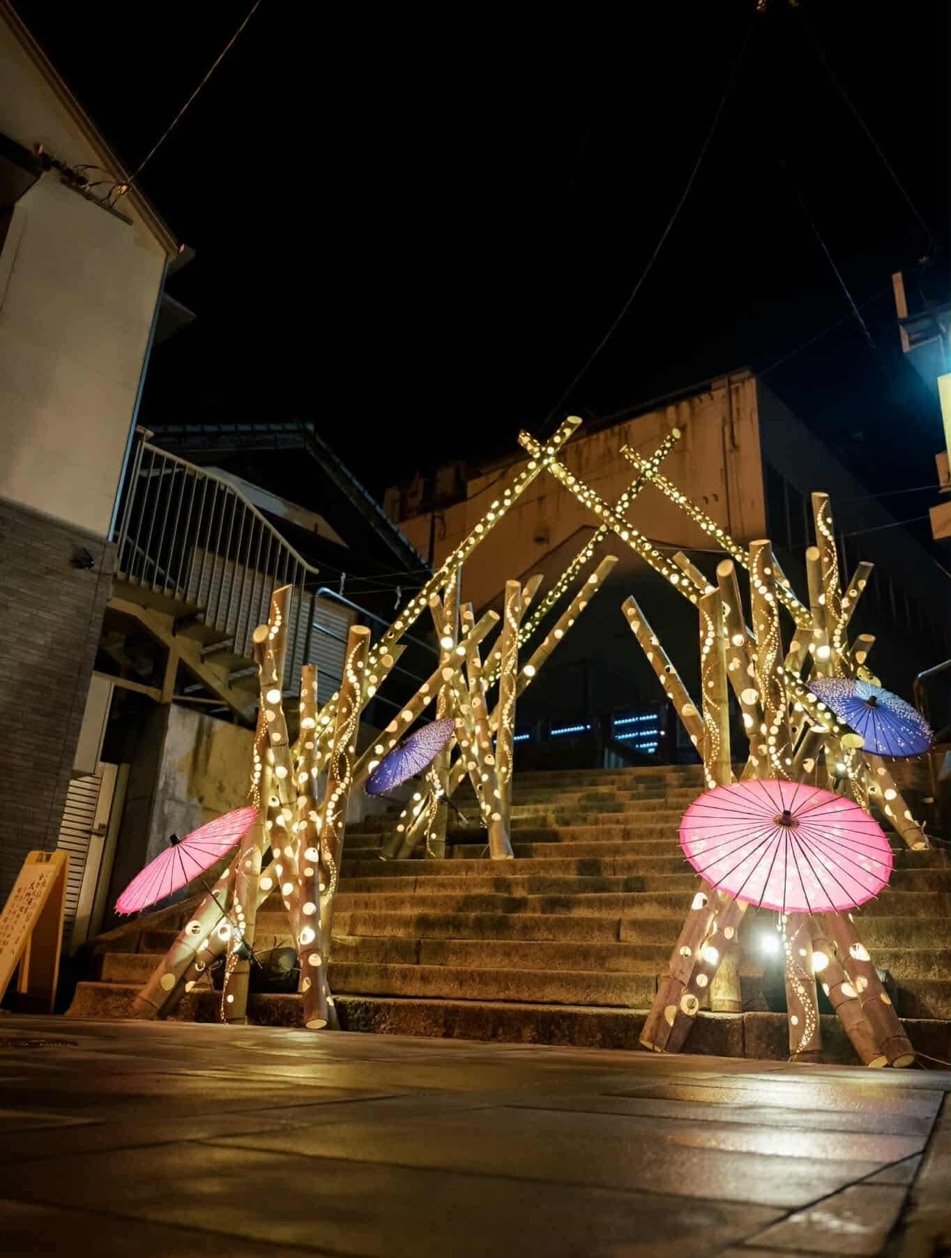琴平山博覧会実行委員会(琴平町)主催の関係人口型アートフェス『琴平山博覧会2025』の新たなプロジェクトとして、11月9日から「琴平×まんのう 竹あかりプロジェクト」の展示が始まりました。12月25日までの毎夜(17時30分~22時)、金刀比羅宮の表参道が約150基の竹あかりで幻想的にライトアップされます。