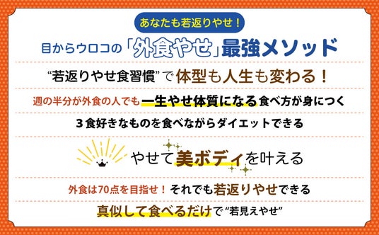 本書を読めば、「外食が多くてもやせられるの?」という疑問を払拭し、若返りやせダイエットの食事術が身につきます。まさに今の時代に合った外食やせの知識をアップデート! どんな食事のシーンでも若返りやせするための食べ合わせ方を学べます。