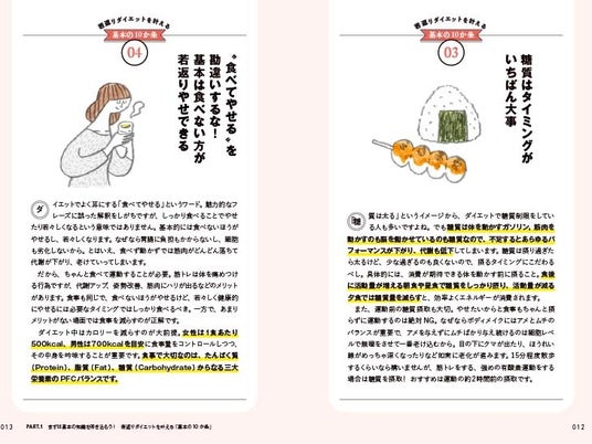本書ではまず、ダイエットで重要と言われている「たんぱく質」や、若返り要素としても重要な「脂質」、「糖質」の摂り方はもちろん、食物繊維やビタミンミネラルなど、役立つ栄養素についての基本の知識を習得できる10か条を掲載。まずはこの内容を頭に叩き込んで、外食やせダイエットをスタートすることができます。
