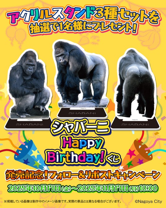 「シャバーニ Happy Birthday! くじ」は、10月20日(月)に誕生日を迎える、東山動植物園の「イケメンゴリラ」として有名な「シャバーニ」の誕生日を迎えることをお祝いするもので、フォトビジュアルを使用した「ダイカットクッション」や「顔ハンガー」、「アクリルスタンド」などが賞品となっています。
