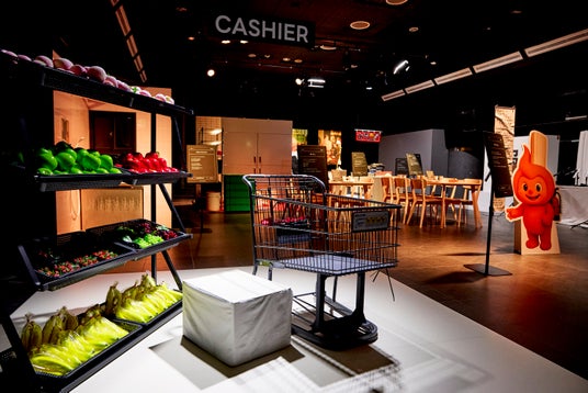 本物のアイスケースの上に寝そべることができる、体験型展示。