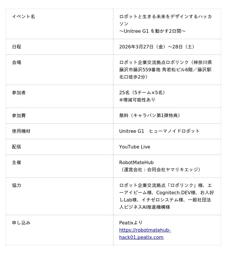 RobotMateHub(運営会社:合同会社ヤマリキエッジ、本社:東京都渋谷区、代表:山本力弥)は、2026年3月27日(金)・28日(土)の2日間、神奈川県藤沢市のロボット企業交流拠点ロボリンクにて、日本初※となるヒューマノイドロボット「Unitree G1」を使用したPhysical AIハッカソン「ロボットと生きる未来をデザインするハッカソン」を開催いたします。ロボット事業を学びたいエンジニア、サービスデザインに興味のあるデザイナーやビジネスマンなど、多様なバックグラウンドを持つ方々を募集し、「人とロボットの共生社会」をテーマにアイデアを競います。参加費無料(キャラバン第1弾特典)、応募締切は3月15日を予定しています。