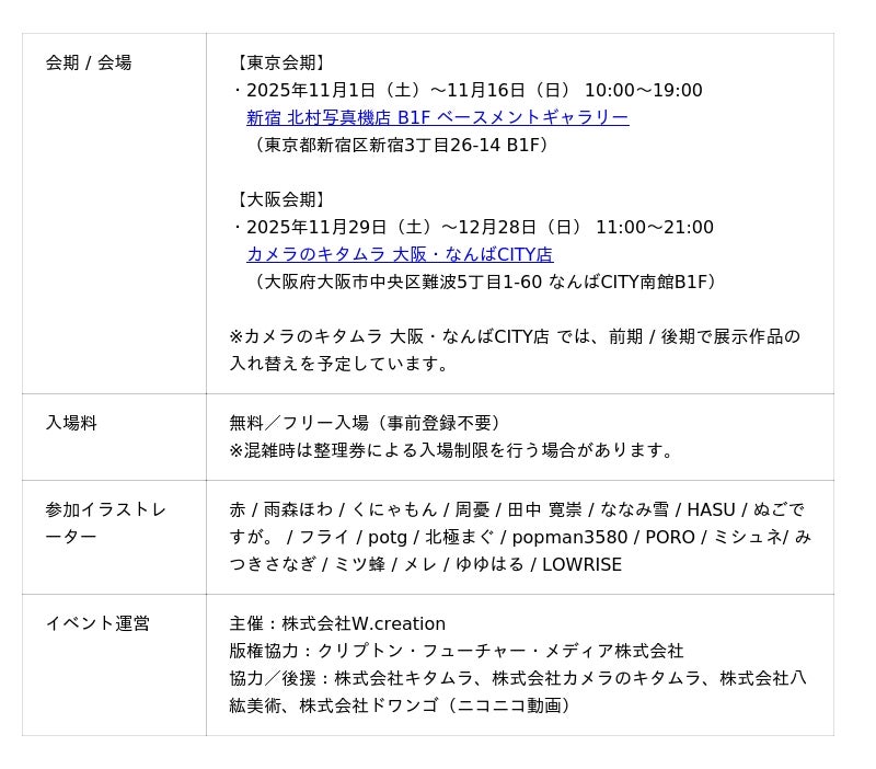 株式会社W.creation(本社:東京渋谷区、代表取締役社長:山中 圭)は、初音ミクのイラスト展「FOCUS ON MIKU」を 2025年11月1日(土)より「新宿 北村写真機店」、11月29 日(土)より「カメラのキタムラ 大阪・なんばCITY店」にて開催いたします。さらに、本展と連動して株式会社カメラのキタムラ主催による「初音ミク×カメラのキタムラ コラボレーションイベント」も同時開催いたします。