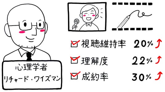 さらに、イギリスの心理学者 リチャード・ワイズマン博士の研究によると、イラストムービーは実写の動画に比べて、全く同じ内容でも、視聴維持率が平均20%アップ、内容の理解度が平均22%アップ、成約率が平均30%アップするという研究結果が出ています。