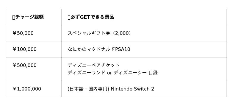 例:期間中10万円チャージした場合、スペシャルギフト券(2000)となにかのマクドナルドPSA10をプレゼントいたします。