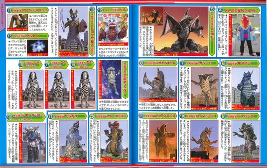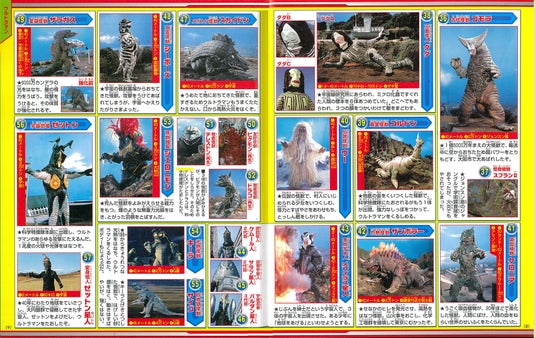 全怪獣・宇宙人の写真はもちろん、身長・体重・出現場所などのデータ、能力や活動などの情報が作品ごと、登場順に載っているので、名前は覚えているのに姿が思い出せないとか、どんな活動をした怪獣だったか忘れた、というときには最適ですし、ただページをめくってさまざまな怪獣の雄姿を眺めるだけでも眼福の気分になれることでしょう。