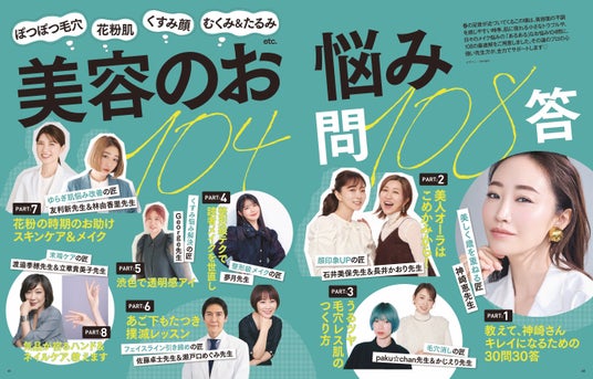 今月号の大特集は、「美容のお悩み104問108答」。これは毛穴や花粉、くすみ顔にフェイスラインのむくみ&たるみ、指先の乾燥まで、春の足音がヒタヒタと聞こえてくるこの時季に気になる「あるある」な悩みを、スキンケアで、メイクで、解決するというもの。各界のプロフェッショナルの先生に編集部が総力を挙げて取材をし、104問の質問に108通りの最適解を導き出しました。