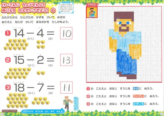 プレスクール世代にも大人気の「マインクラフト」の学習ドリル。二桁までの足し算、引き算を解いて、その答えに従って色を塗っていきます。マインクラフトは四角いブロックでできた世界。四角いマス目を塗り進めていくことで、スティーブやアレックス、エンダードラゴンなど人気MOBが出現! 従来にはない新しい仕様の塗り絵となります。