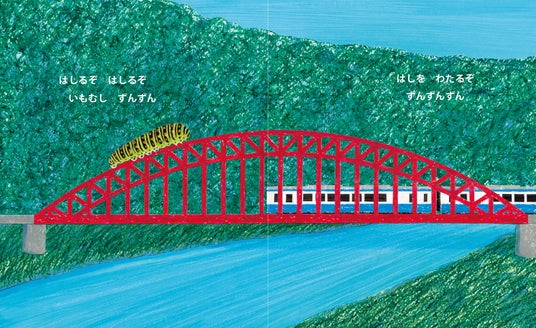 電車に遠慮して、橋の上を渡っていくいもむしちゃん。『いもむしずんずん』より。