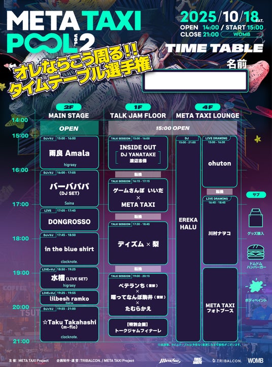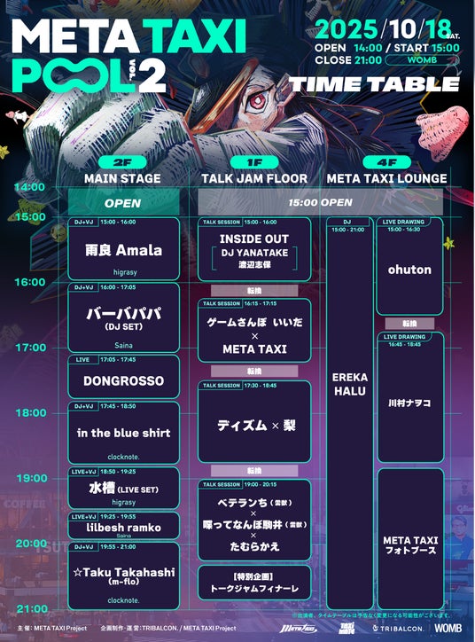 10月18日(土)渋谷・WOMBにて開催されるYouTubeチャンネル『META TAXI / メタタクシー』が手掛けるリアルイベント『META TAXI - POOL Vol.2-』のタイムテーブルが公開されました。