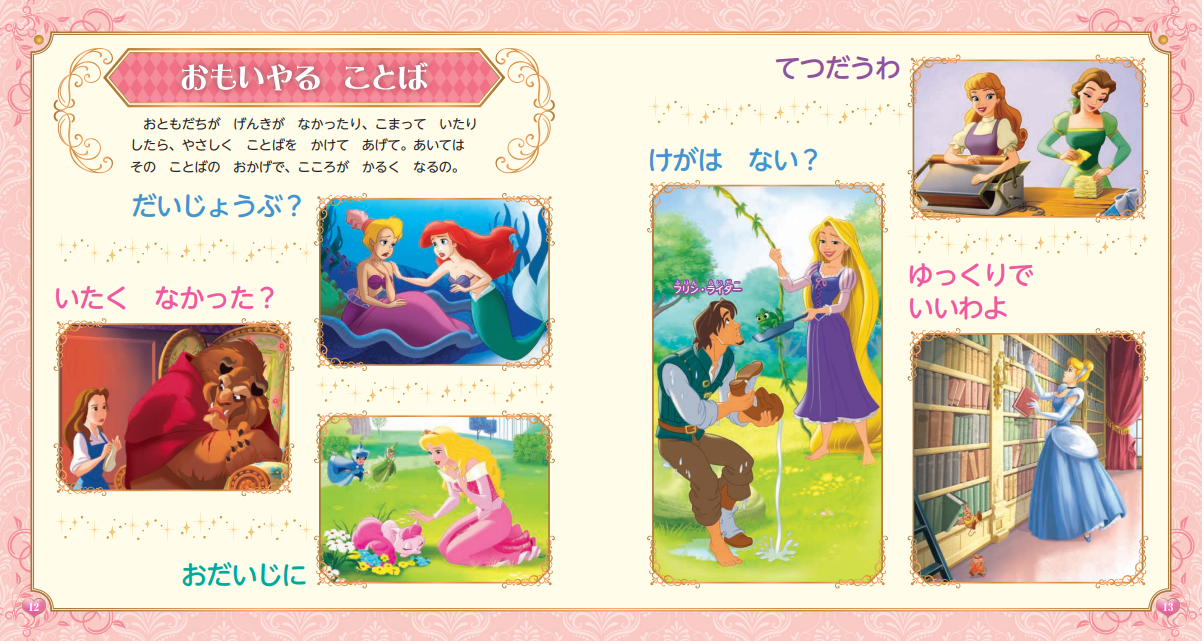 言葉とともに、ディズニープリンセスのイラストも豊富に掲載。あこがれのプリンセスになったつもりで声に出すことで、楽しみながら美しい言葉遣いを身につけることができます。イラストを通して具体的な場面も想像できるので、直感的に言葉の使い方が理解できる内容です。