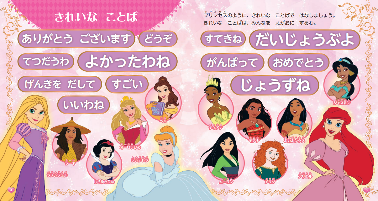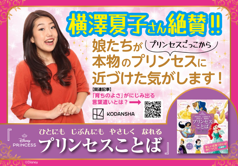 また、3人の娘とともにディズニー好きとして知られる横澤夏子さんも絶賛! ディズニープリンセスのキラキラとした世界観のなかで、優しく丁寧な言葉が自然と身につく一冊は、お子さまの言葉と心の成長を願う方におすすめです。