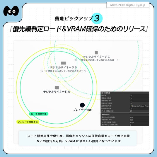 "優先順判定ロード"や"VRAM節約の機構"や"ロード中アニメーション"、"設定確認モード"など細かいところまで対応しています。 多機能なだけでなく、丁寧に作られた使いやすいデジタルサイネージです。 ホームワールドやイベント、写真展など様々なシーンでご活用ください!