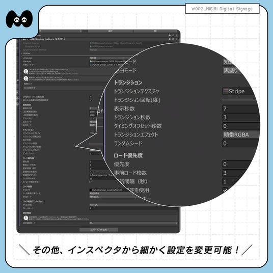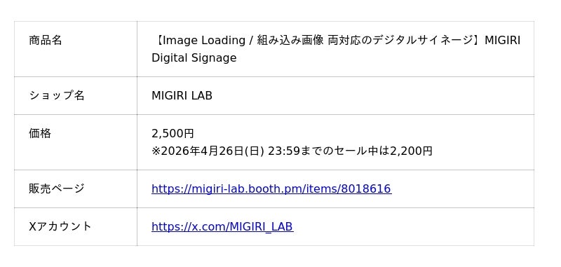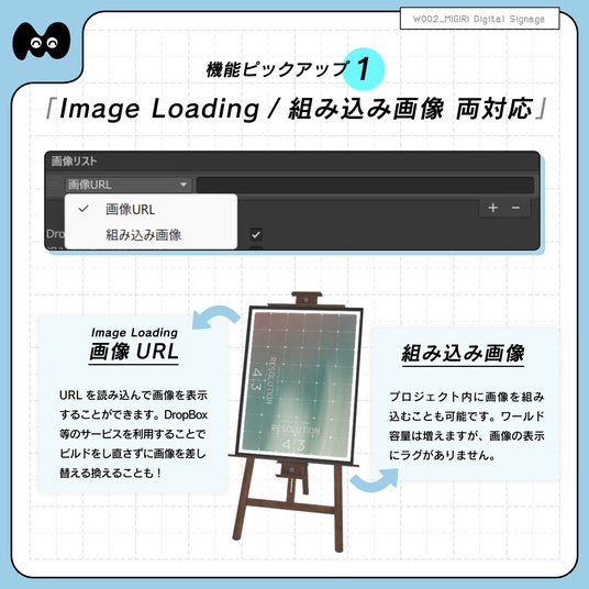 「MIGIRI Digital Signage」はImage Loadingと組み込み画像に対応したデジタルサイネージです。VRChatのワールド制作での使用を想定しています。