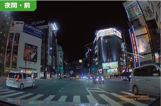 前カメラは4K映像なので、昼夜とも街の雰囲気を鮮明に伝えてきます。夜間は明るめに映っています。後カメラも画角は広め。追加費用なしで駐車監視でき、別売りのマイクロ波センサーを使えばさらに高度な監視ができるのが便利です。