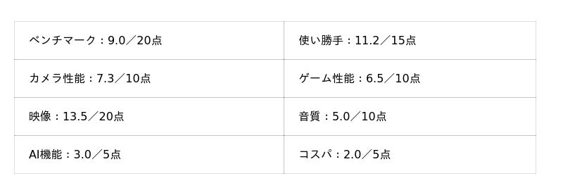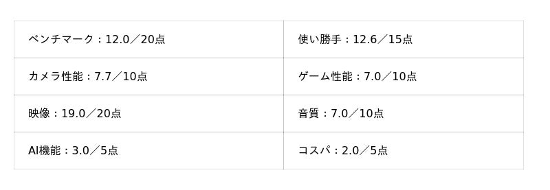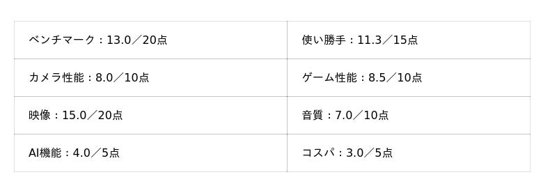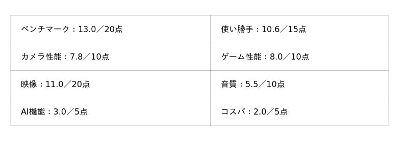 ベンチマークテストでは「iPhone16e」と同等と優秀でした。プロカメラマンが「誰でもキレイに撮れる」と太鼓判を押したカメラ性能と、独自AIの賢さは他製品を圧倒。欠点が少なく、バランスも良いので、スマホ選びに迷ったら本製品の購入をおすすめします。