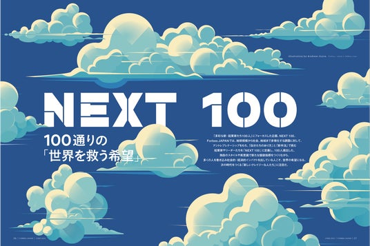 「多彩な新・起業家たち100人」にフォーカスした企画、NEXT100。Forbes JAPANでは、地球規模から社会、地域まで多様化する課題に対して、アントレプレナーシップをもち、「自分たちのあり方」と「新手法」で挑む起業家やリーダーたちを「NEXT100」と定義し、100人選出した。独自のスタイルや美意識で新たな価値指標をつくりながら、多くの人を巻き込み社会的・経済的インパクトを出している人こそ、世界の希望になる。次の時代をつくる「新しいクレイジーな人たち」に注目だ。