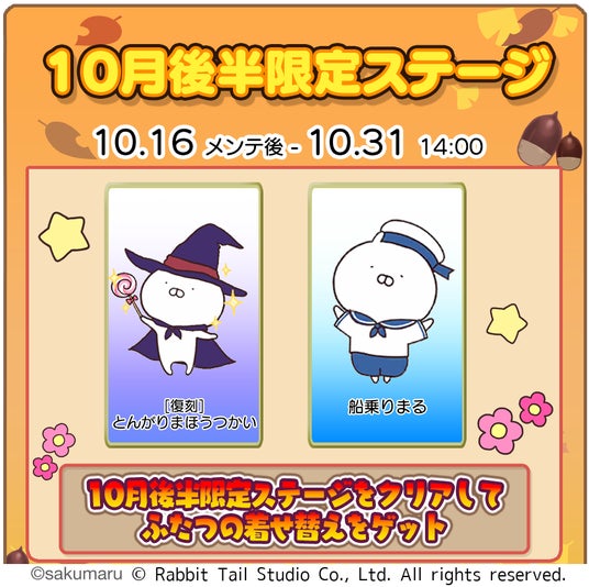 対象ステージクリアで、とんがりまほうつかい(復刻)、船乗りまるの着せ替えがゲットできます!