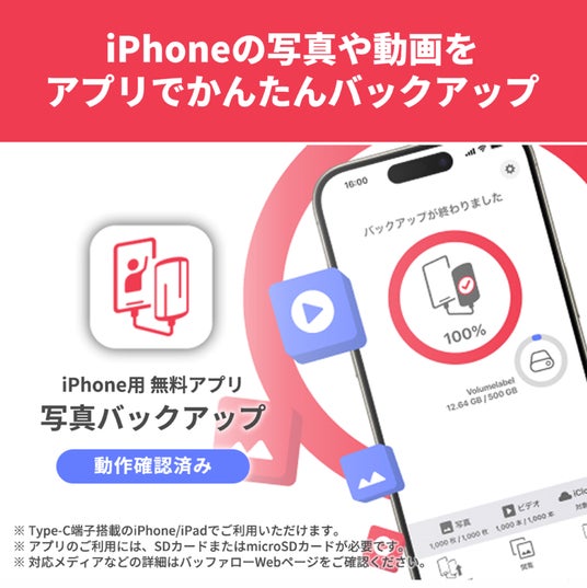 本商品はiPhone・iPadに保存している写真・ビデオを外部USBストレージにバックアップ(データのコピー)できる無料のアプリケーション「写真バックアップ」に対応しています。