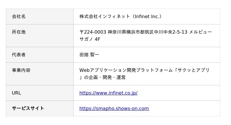 株式会社インフィネット(本社:神奈川県横浜市都筑区、代表:田畑智一、以下「当社」)は、仲間のスマートフォン画面を同期させ、その場を光の演出で包み込む次世代イベント支援ツール「SMAPHO Shows On」をリリースしました。本サービスの最大の特徴は、莫大な予算を持たない主催者でも、手軽に導入できる点にあります。身の回りの小さなイベントを、遊び感覚で盛り上げる。20人までは完全無料です。