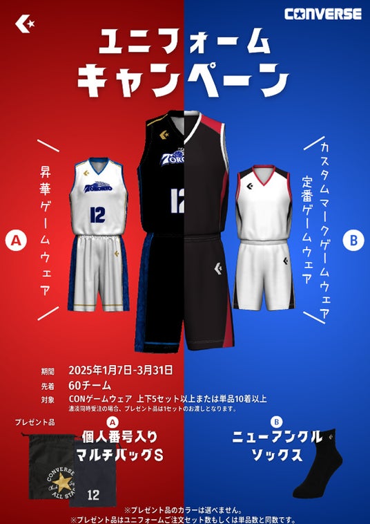 ゼット株式会社(本社/大阪市天王寺区、代表取締役社長/渡辺裕之)の製造部門を請け負うグループ会社のゼットクリエイト株式会社(本社/大阪市天王寺区、代表取締役社長/和田耕一)が、コンバースブランドのアスレティックアクティブウェア・バッグのライセンシーとして、「コンバース ユニフォーム キャンペーン」を2025年1月7日よりスタートしました。