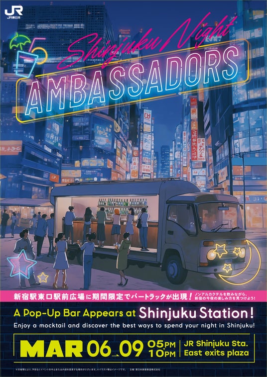 【内容】 AMBASSADORS(新宿のまちを安心・安全にお楽しみいただくための案内人)による新宿の観光案内およびバートラックでのノンアルコールカクテルの提供(有料)を行います。