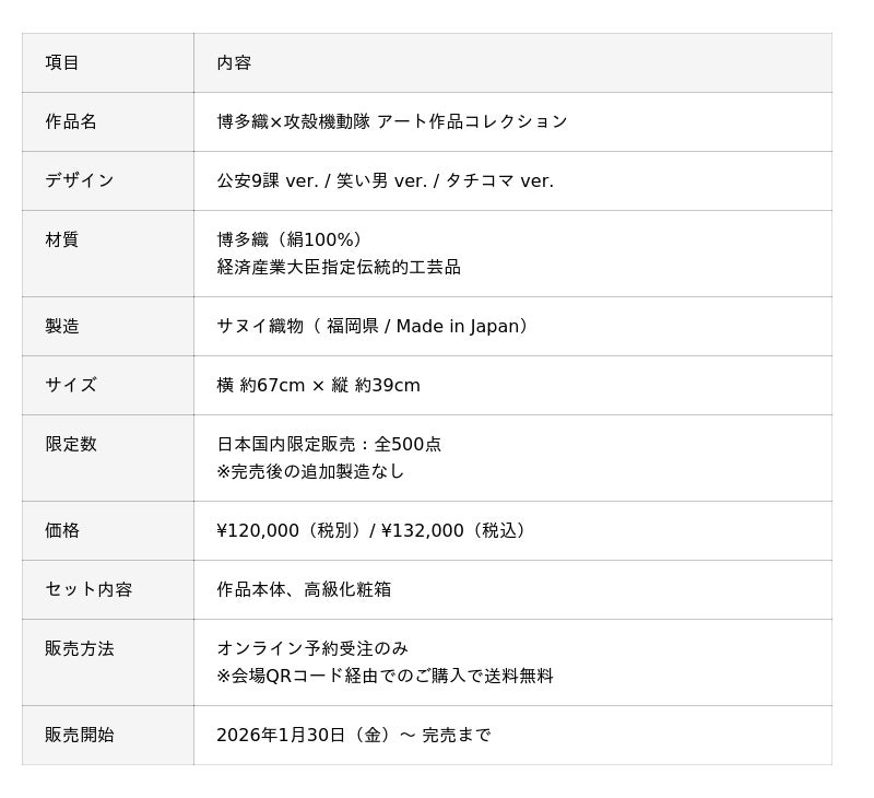 本作品は、鎌倉時代から脈々と受け継がれてきた博多織の技術と、攻殻機動隊が描く2030年代の電脳社会を融合させた、まさに「時代を超えた出会い」です。グッズではなく、工芸品として。ファンアイテムではなく、アート作品として。このコラボは、伝統工芸の可能性を広げる、新たな一歩となります。