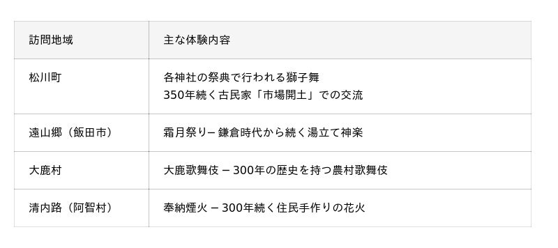 松川町・遠山郷・大鹿村・清内路の4地域を訪問。各地域で1泊2日~2泊3日滞在し、以下の活動に参加します。