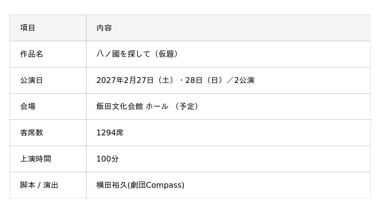 初開催となる2026年度は、松川町・遠山郷・大鹿村・清内路の4地域を訪問。霜月祭りや大鹿歌舞伎、奉納煙火など数百年続く伝統行事に地元の人々と一緒に参加し、その体験をもとにオリジナルミュージカルを創作。2027年2月に飯田文化会館(1294席)で上演予定です。