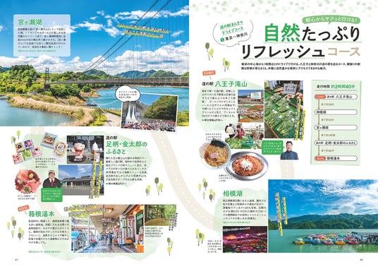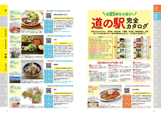 さらに、85駅の情報を「道の駅 完全カタログ」として一覧性を高め、比較検討できるようにしました。レストラン、物産品販売所、BBQや温泉施設といった各駅の機能がひと目で分かるようになっています。また、特集の最後には、道の駅と観光地を満喫する「東京・神奈川」「千葉」「山梨」の3つのモデルコースをご提案しています。