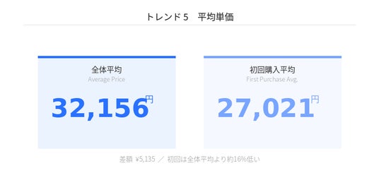 初回平均に対し、リピーターを含む全体平均が約5,000円上回っていることから、初回は比較的低価格帯から始まり、その後のリピート購入に伴って単価が上昇する傾向が見られます。