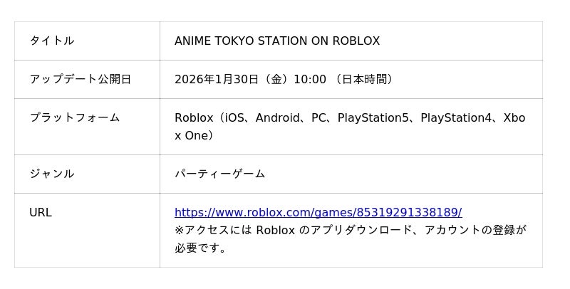 ■「ANIME TOKYO STATION ON ROBLOX」特設ページ:https://animetokyo.jp/roblox/