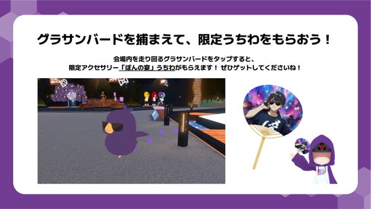イベント開始前から終了後までワクワク感が続く、限定のオリジナルアクセサリーを多数ご用意しています。無料で配布する「ぼんの宴 in cluster」うちわはワールド内を周遊する「グラサンバード」をタップすると入手が可能です。