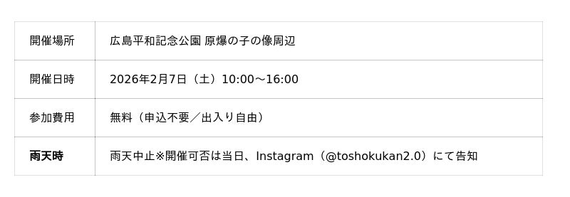 Art Aid for All(代表:長谷川忠広/広島市)は、2026年2月7日(土)、広島平和記念公園・原爆の子の像周辺にて、被爆樹木・リサイクル材・広島県産材を用いた参加型インスタレーションアートプロジェクト《Re:Arch Hiroshima(リアーチ・ヒロシマ)》を実施します。