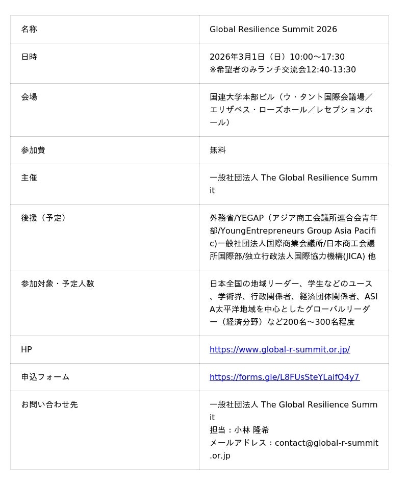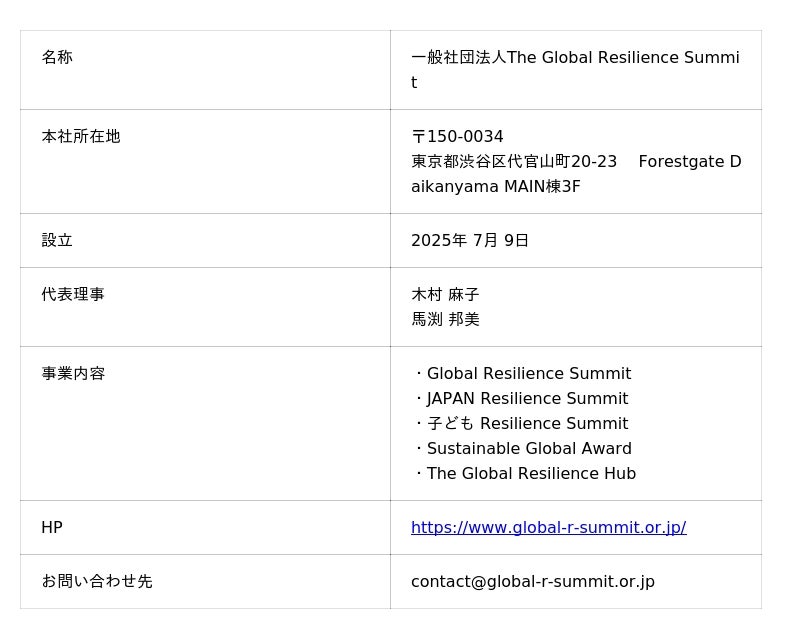 一般社団法人The Global Resilience Summit(所在地:東京都渋谷区/代表理事: 木村 麻子 、馬渕 邦美)は、2026年3月1日(日)国連大学本部ビル にて「Global Resilience Summit 2026」を開催いたします。